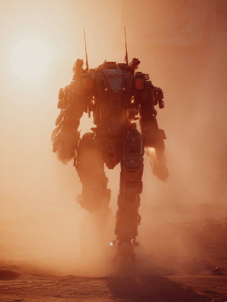 “A massive mech emerges from a smoking crater in mars, lasers firing, its armor a mix of Titanfall 2’s futuristic aesthetics and Mechwarrior’s rugged, industrial mechanics. Hydraulic pistons hiss as it steps forward, armed with pulse cannons and missile pods. The battlefield around it is filled with wreckage and smoke, the remnants of a fierce battle. Dust and debris rise with each step, creating an epic, cinematic scene of destruction and war”