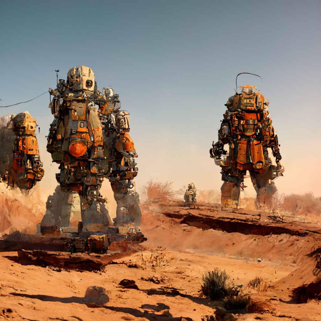 Orange-painted machines that looked more like construction equipment having an identity crisis than military hardware. Multiple robots in odd proportions, standing on a Martian landscape that I’d probably accept but mechs that I absolutely wouldn’t. There’s a peculiar quality to early AI-generated images—dreamlike, almost surreal, with details that your brain knows are wrong even if you can’t immediately articulate why.
